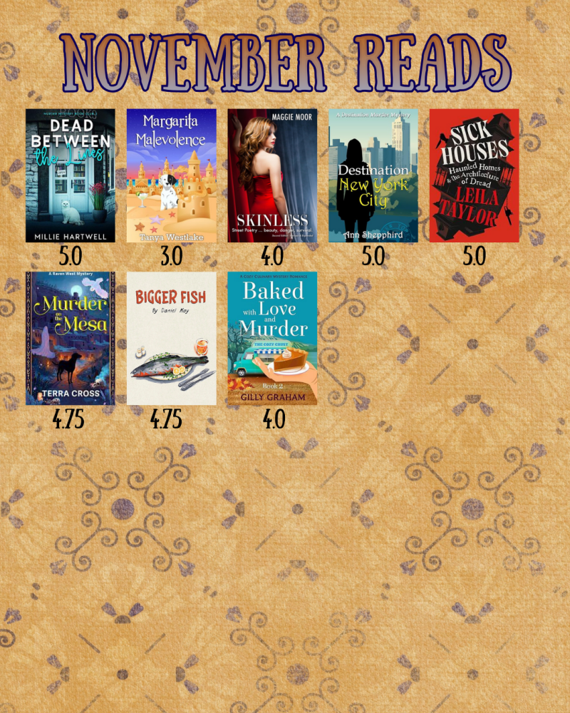 Well November is over and now it December and the festive period. I only read around 8 books, three I rated a 5 and the lowest rating was a 3. The stand out were Sick Houses by Leila Taylor a non fiction book I listened to as a audiobook about how horror genre in film, TV and literature uses the architecture and the ideology of the home against our preconceived notions. Another one I enjoyed even though I rated it a 4.75 was a Bigger Fish by Daniel Kay a Canadian mystery comedic caper. I hope to end the year with some good reads maybe something scary to go along with the cozy.